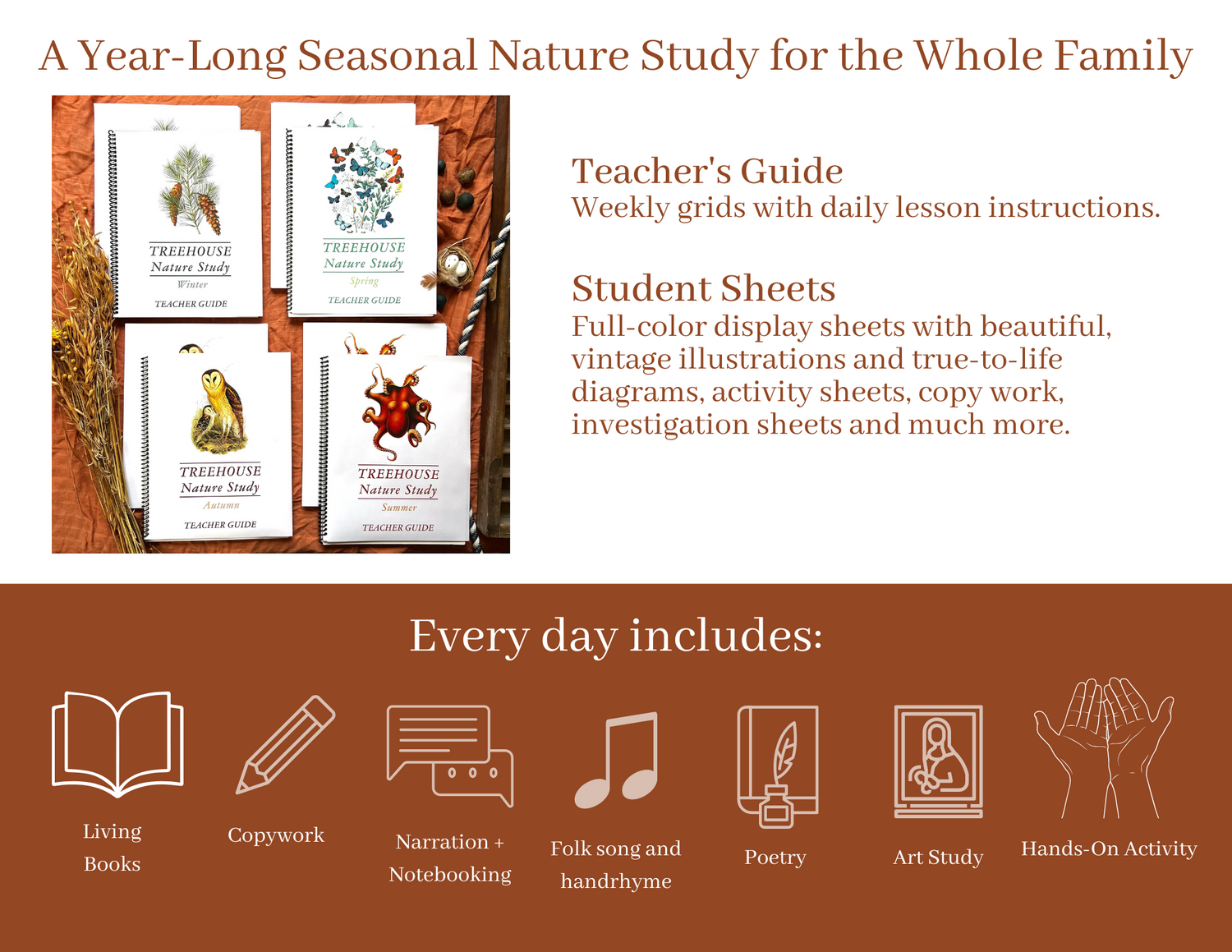 “Early in our home education I went on a search for a gentle guide to take our family on an educational journey through the seasons. I wanted something that was simple and beautiful and that introduced my children to art, poetry, living books, and nature in an organic way. I couldn't find what I had dreamed up in my head, so instead I developed it. My hope is that Treehouse Nature Study is a tool to truly awaken delight and wonder in your home education.”