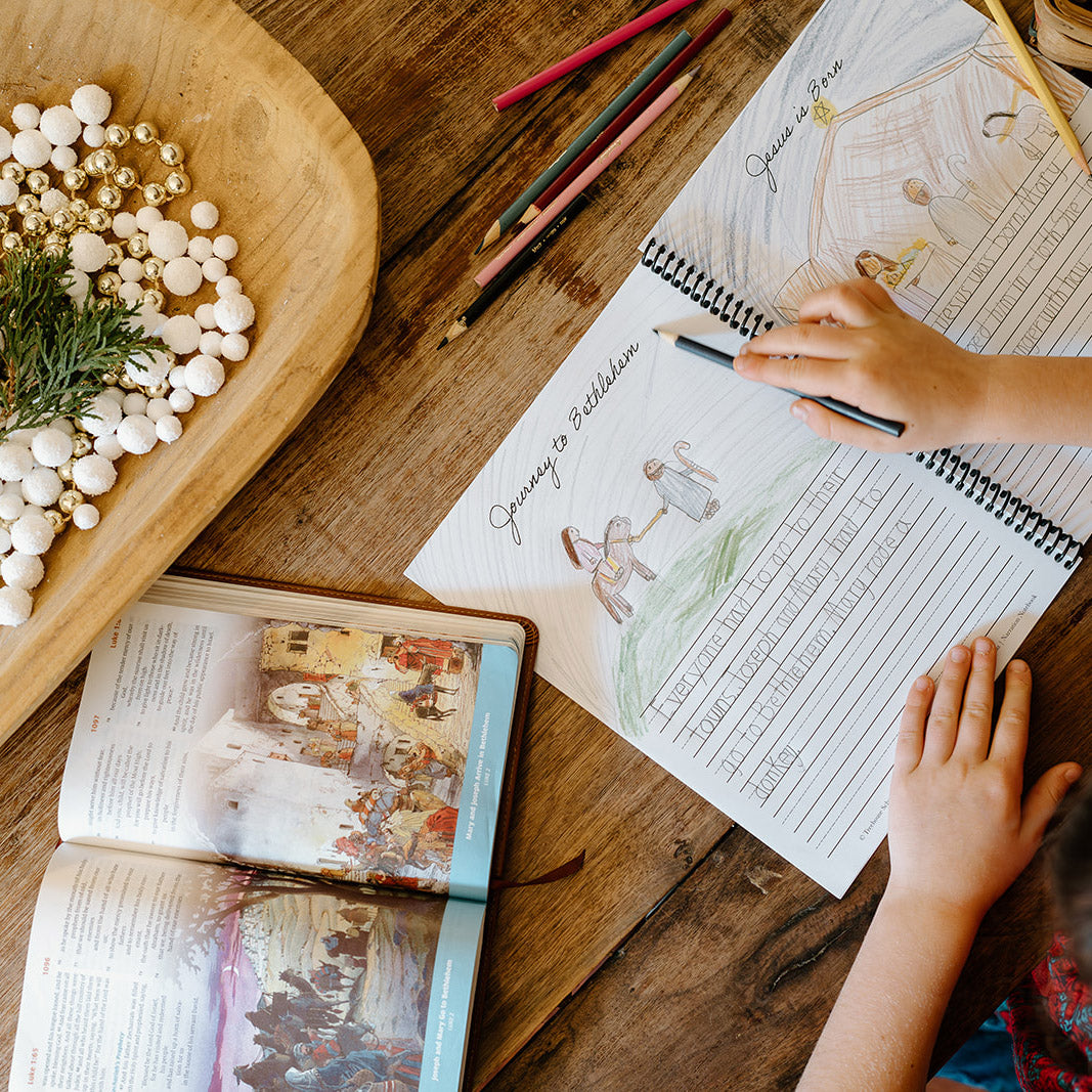 At the core of A Connected Christmas: Around the World is the Christmas Story Narration Notebook. Your family will walk through the Biblical Christmas story each day as your child narrates and illustrates each passage. At the end, you'll have a 17-page keepsake.