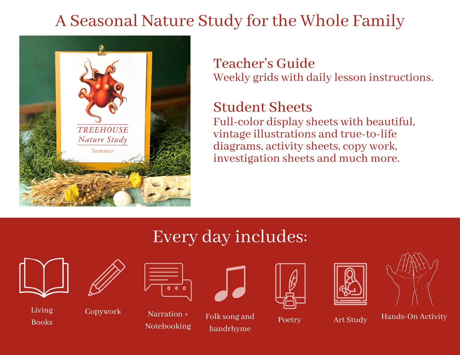“Early in our home education I went on a search for a gentle guide to take our family on an educational journey through the seasons. I wanted something that was simple and beautiful and that introduced my children to art, poetry, living books, and nature in an organic way. I couldn't find what I had dreamed up in my head, so instead I developed it. My hope is that Treehouse Nature Study is a tool to truly awaken delight and wonder in your home education.”