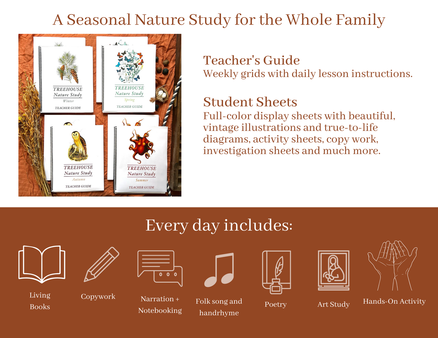 Treehouse Nature Study is a seasonal nature study curriculum designed with family-style learning in mind. It is a gentle guide meant to invite various ages to connect with each other and the world around them through living books, nature notebooking, hands-on projects, and beauty subjects such as poetry, picture study, and folk songs.
