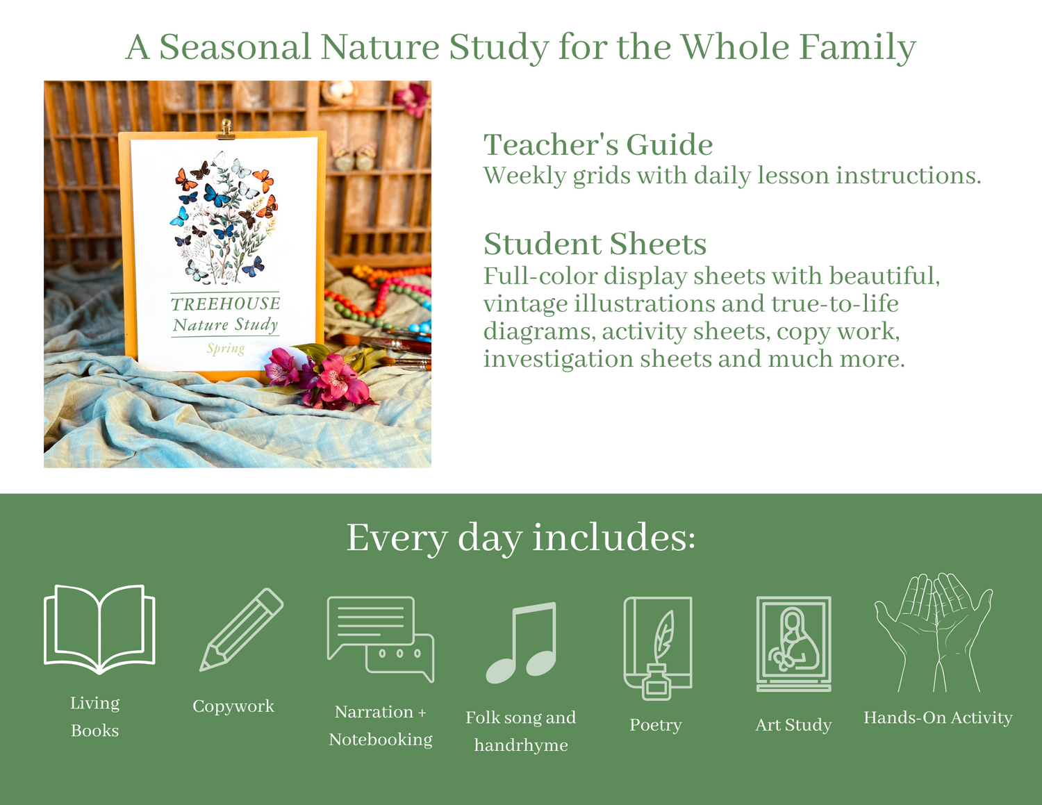 “Early in our home education I went on a search for a gentle guide to take our family on an educational journey through the seasons. I wanted something that was simple and beautiful and that introduced my children to art, poetry, living books, and nature in an organic way. I couldn't find what I had dreamed up in my head, so instead I developed it. My hope is that Treehouse Nature Study is a tool to truly awaken delight and wonder in your home education.”